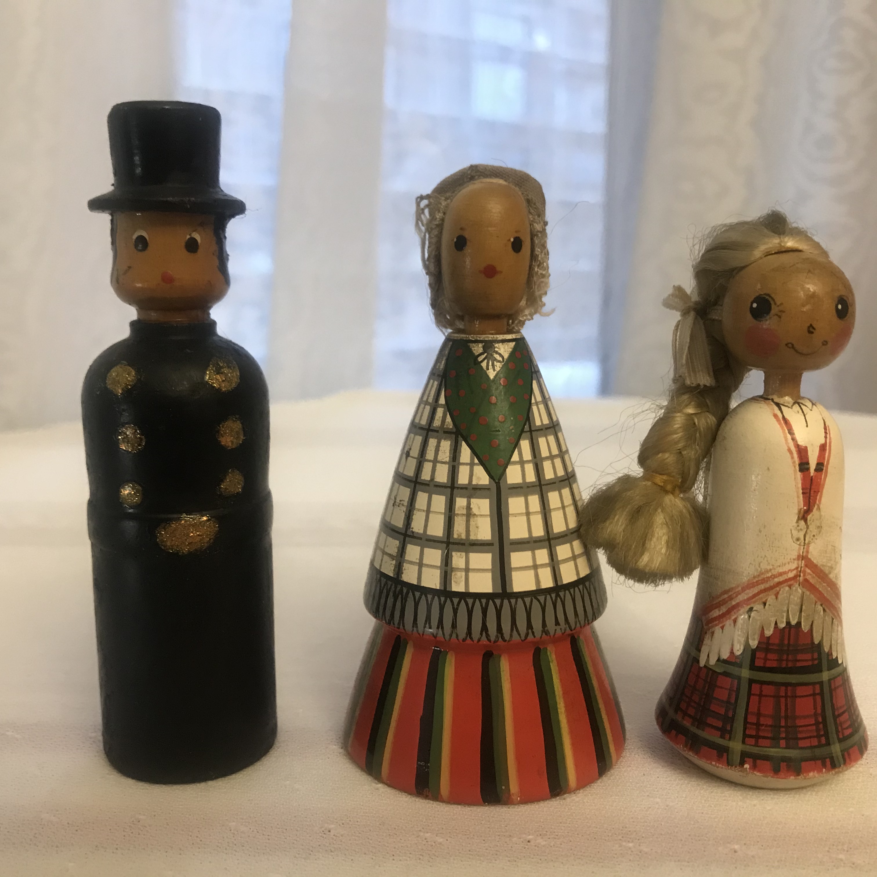 Wooden figurines. Ancient dolls.Three figures of wood. Hutsul family. Dad,mom and daughter.
