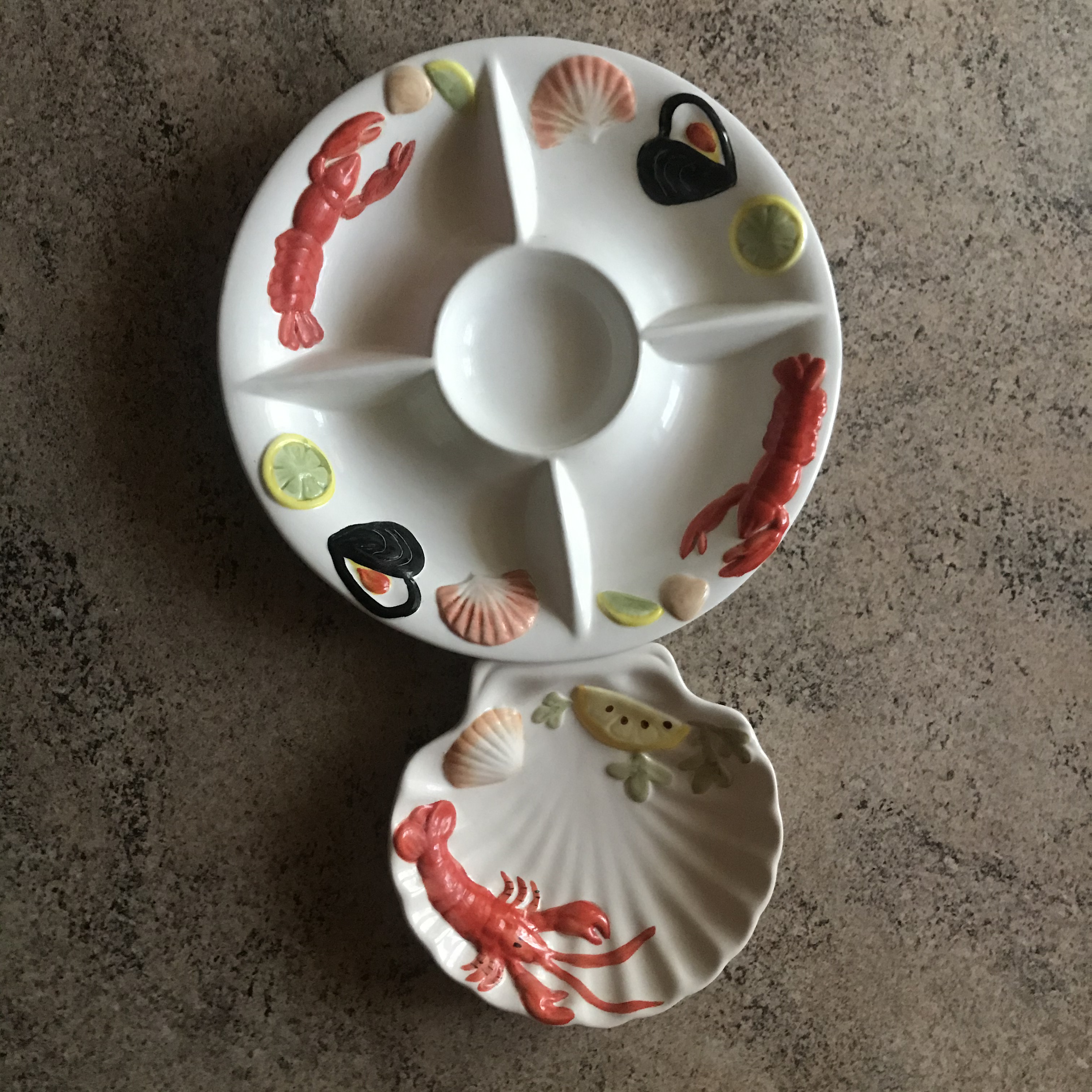 Vintage large two-tiered plate for seafood. Set of plates with the image of lobsters