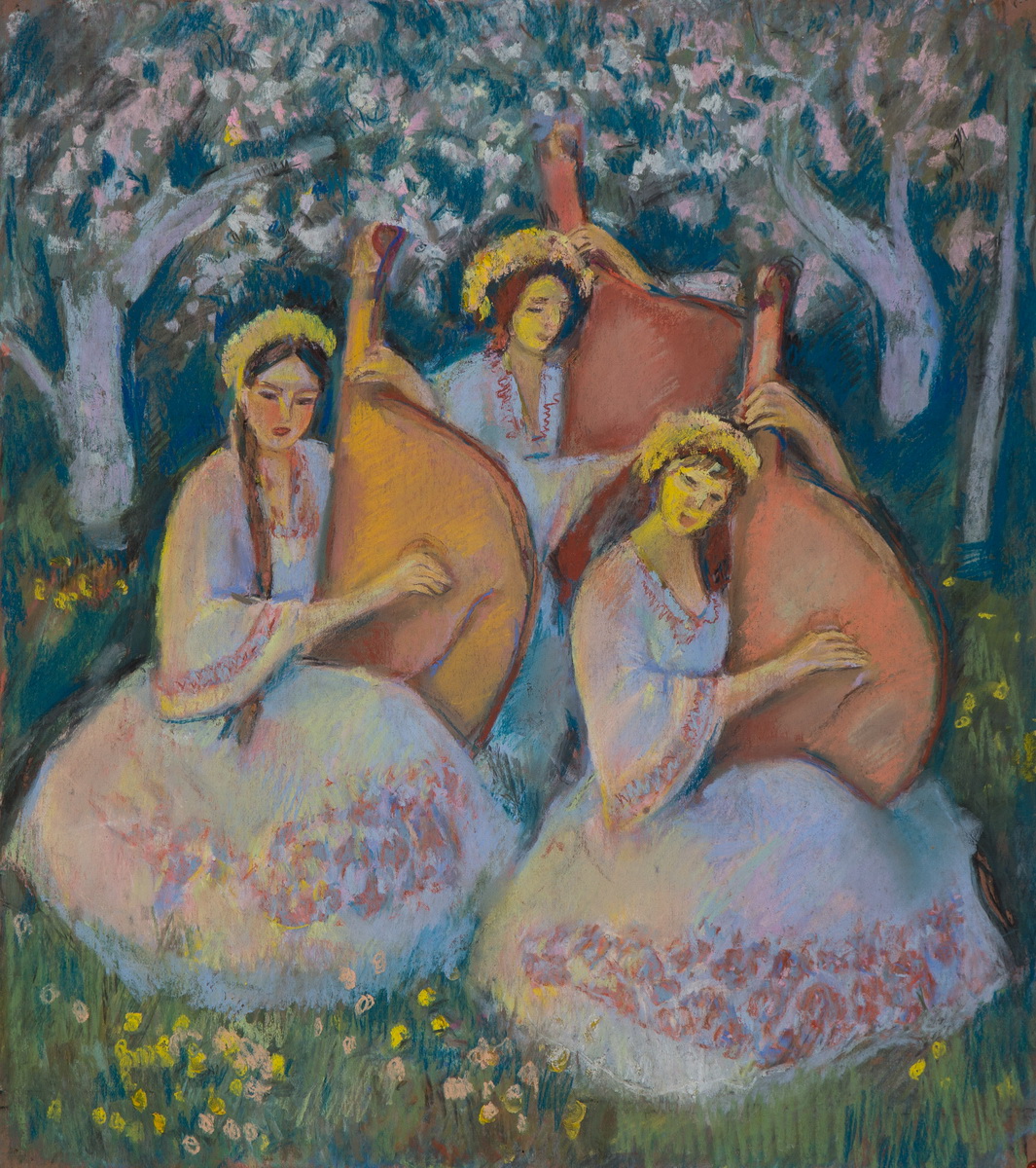 Only print copy on canvas (original sold) “Three girls with flowers play on the bandura”.