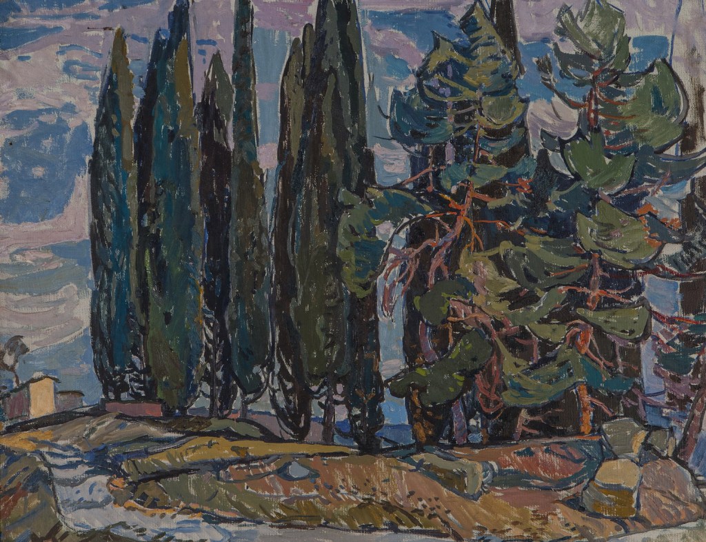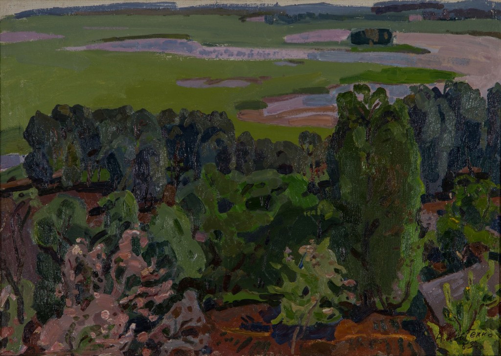 Original oil painting of the famous Soviet Ukrainian artist A. Kostenko, 1974, Summer, Suburb. Green fancy trees