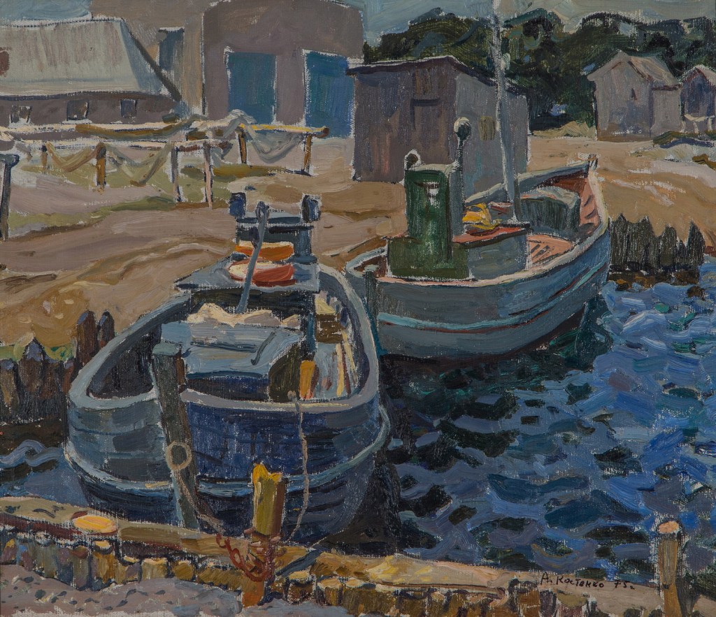 Only print copy on canvas (original sold). Vintage Soviet painting of fishing boats. Coastal landscape. Signed оil рainting