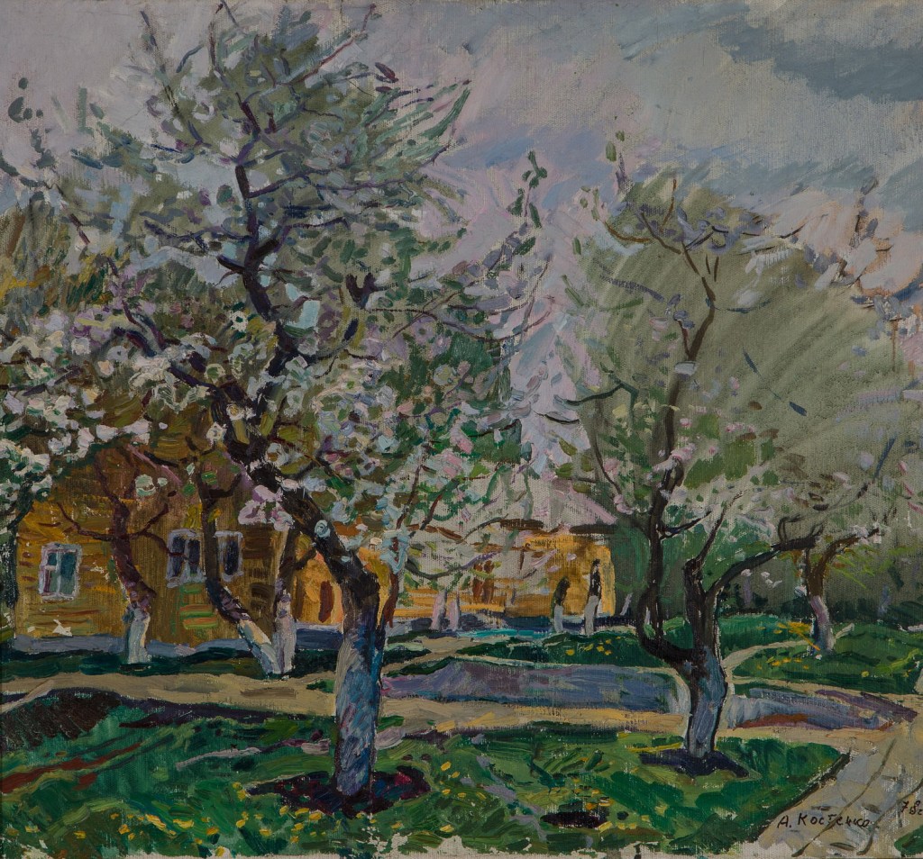 Only print copy on canvas (original sold). Vintage painting on canvas with the signature of the famous Soviet Ukrainian artist A.Kostenko,1975,Blooming apple tree