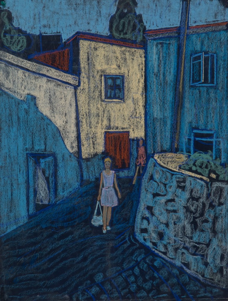 Only print copy on canvas (original sold). A lady walking along the narrow street of the old city.
