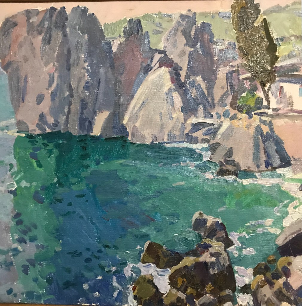 Only print copy on canvas (original sold). Seashore with a cliff, Rocky sea bay. Impressionism. USSR