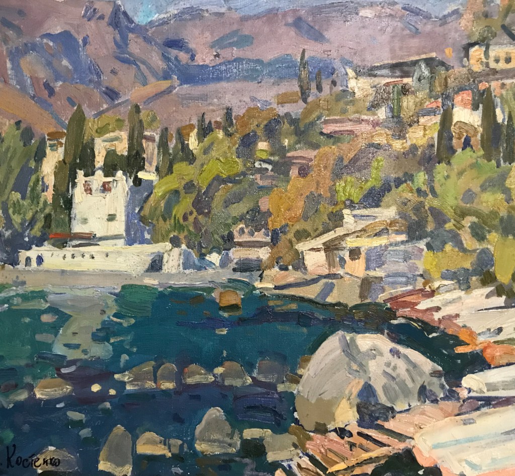 Only print copy on canvas (original sold). Black Sea coast, sea bay, seaside resort village. Impressionism