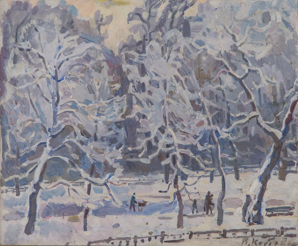 Only print copy on canvas (original sold). Snow genre scene, white trees. Winter fairy tale