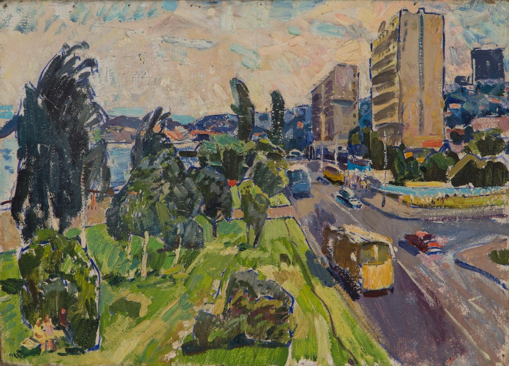 Only print copy on canvas (original sold). Old original cityscape oil by Soviet artist A.Kostenko