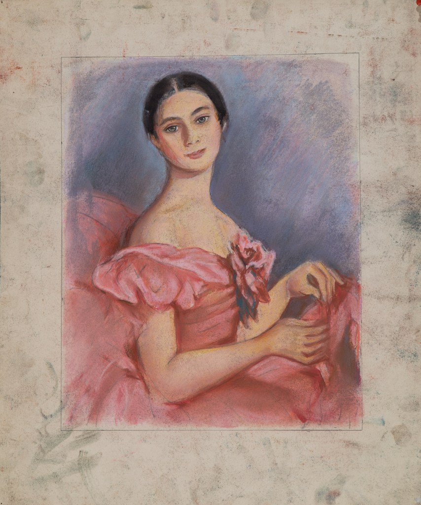 Only print copy on canvas (original sold). Original art of the artist of the USSR V.Kostenko,A lady in a pink dress,Woman Portrait mid century