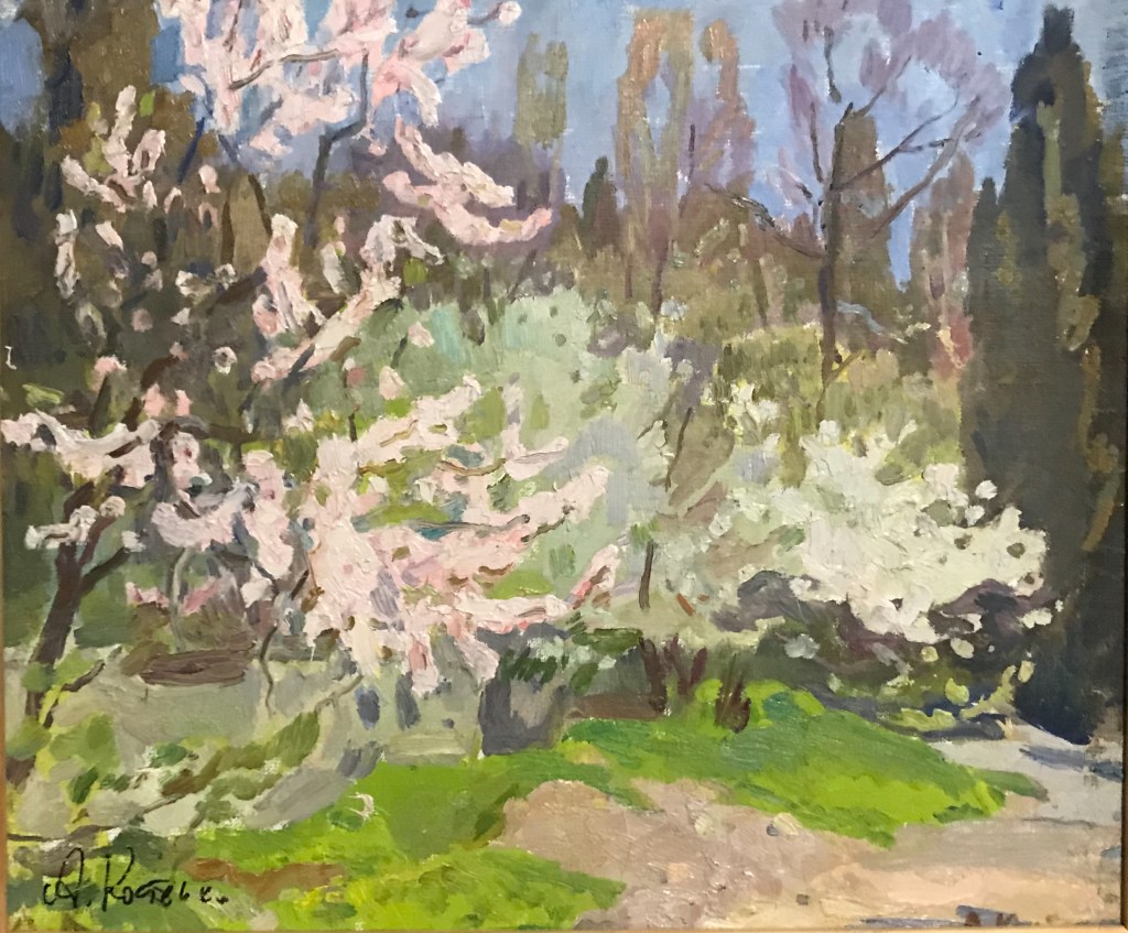 Only print copy on canvas (original sold). Vintage original oil painting, spring landscape, signed by Soviet artist A. Kostenko