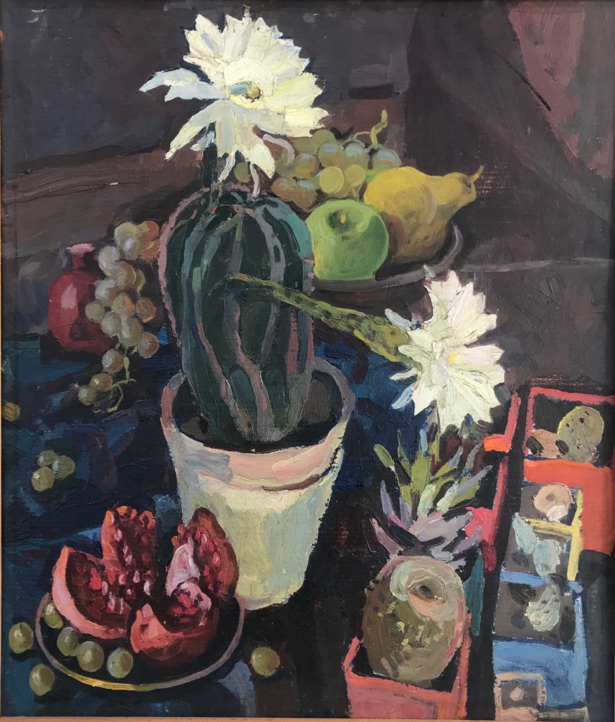 Only print copy on canvas (original sold). Vintage oil painting, Original still life with a blooming cactus