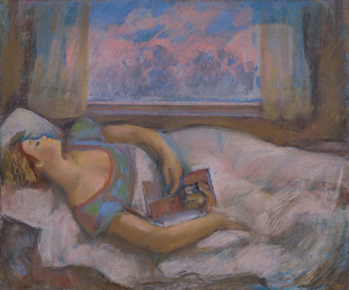 Only print copy on canvas (original sold). Vintage pastel painting by USSR artist V. Kostenko, 1965, Woman sleeps during the day.