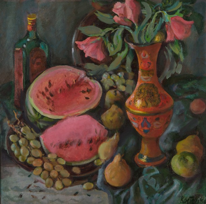 Only print copy on canvas (original sold). Vintage oil painting, original still life signed by USSR artist V.Kostenko. Flowers and fruits.