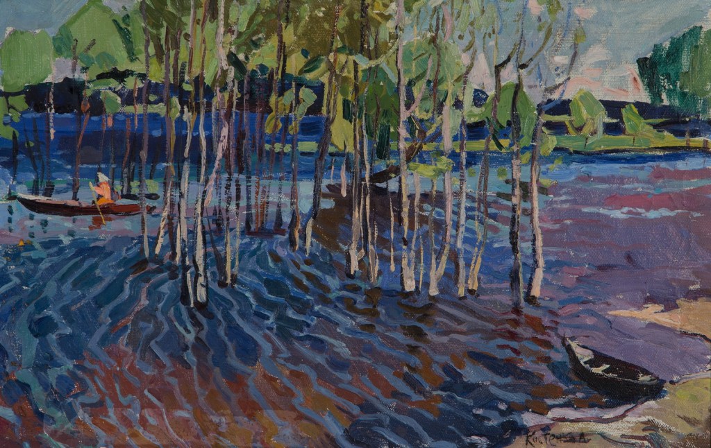 Only print copy on canvas (original sold). Landscape painting. Riverscape, vintage oil painting Soviet artist A.Kostenko, 1969