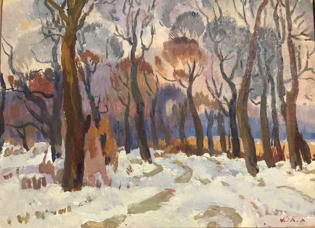 Only print copy on canvas (original sold). Vintage oil painting by Soviet artist A.Kostenko, 1970, original winter landscape. Impressionism