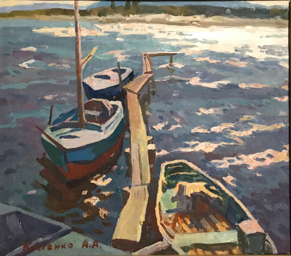 Only print copy on canvas (original sold). Vintage oil painting, original seascape signed by artist of USSR A.Kostenko. Fisherman’s wharf, boats