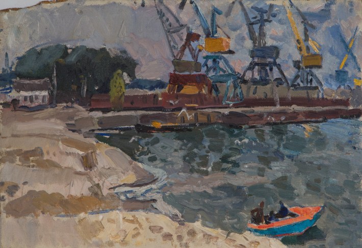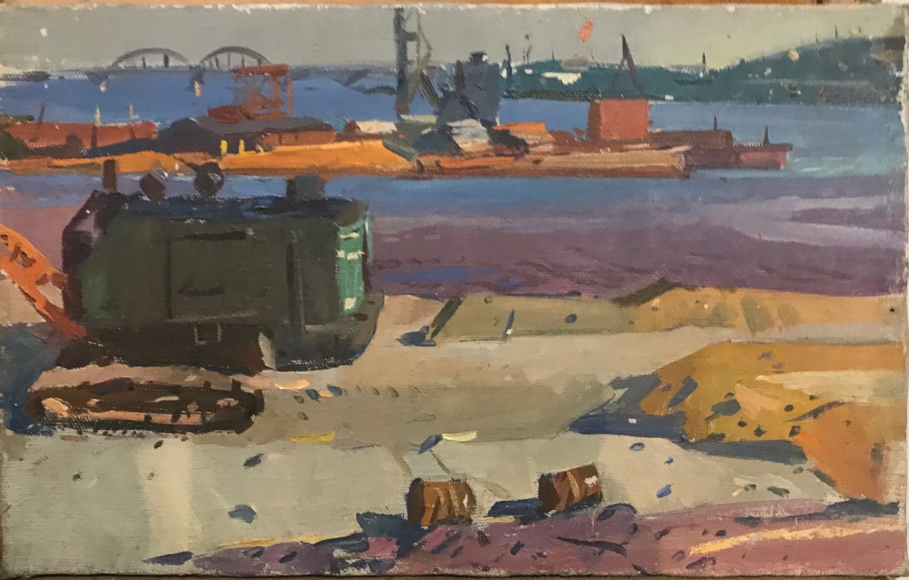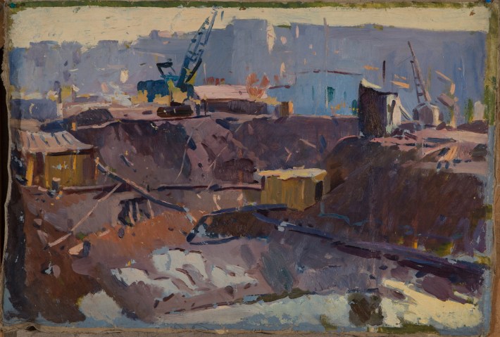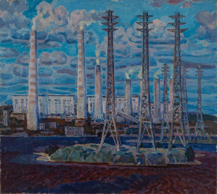 Ancient original oil painting by Soviet artist A. Kostenko, city landscape, industrial landscape. Socialist Realism. USSR