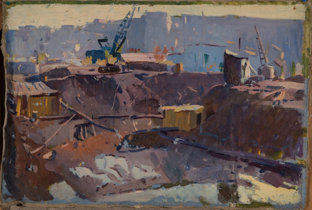 Antique industrial original oil painting mid-century, socialist realism, industrial landscape. Professional art of USSR