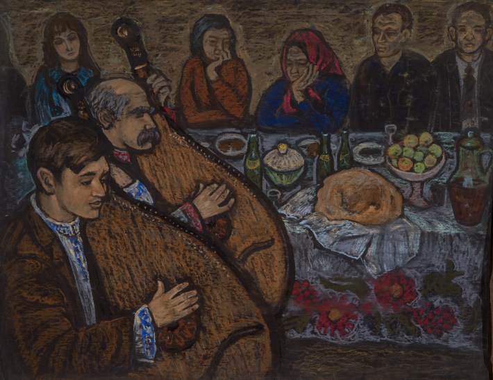 Original pastel old ethnic painting, famous artist Ukraine Kostenko V. family dinner, Ukrainian musicians, ancient rite.