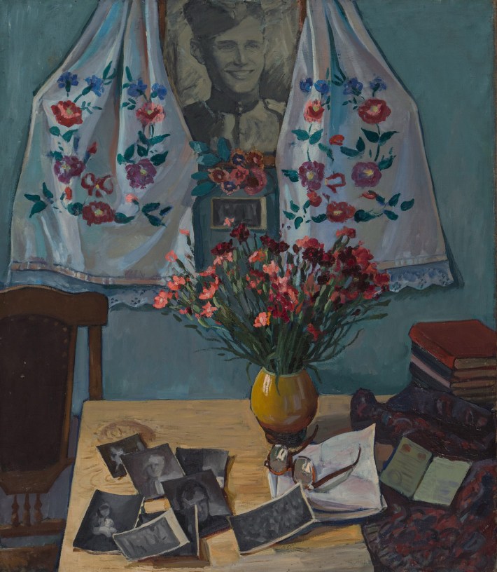 Complex large compositional ancient oil painting on canvas Soviet artist V.Kostenko. Still life of military items.