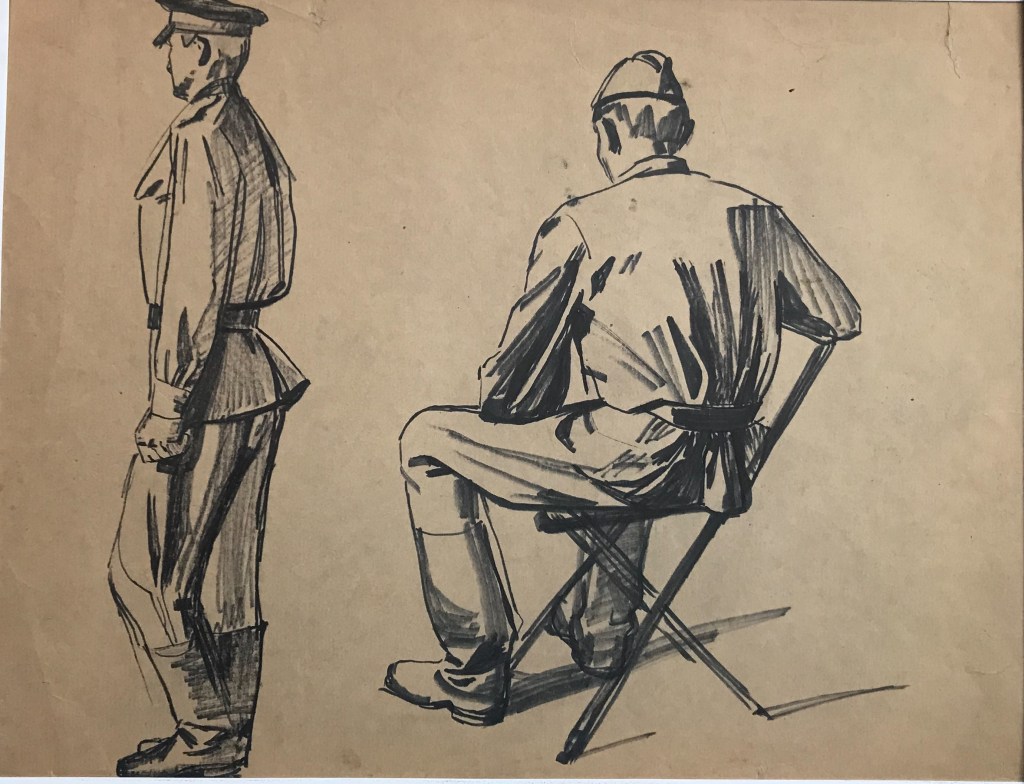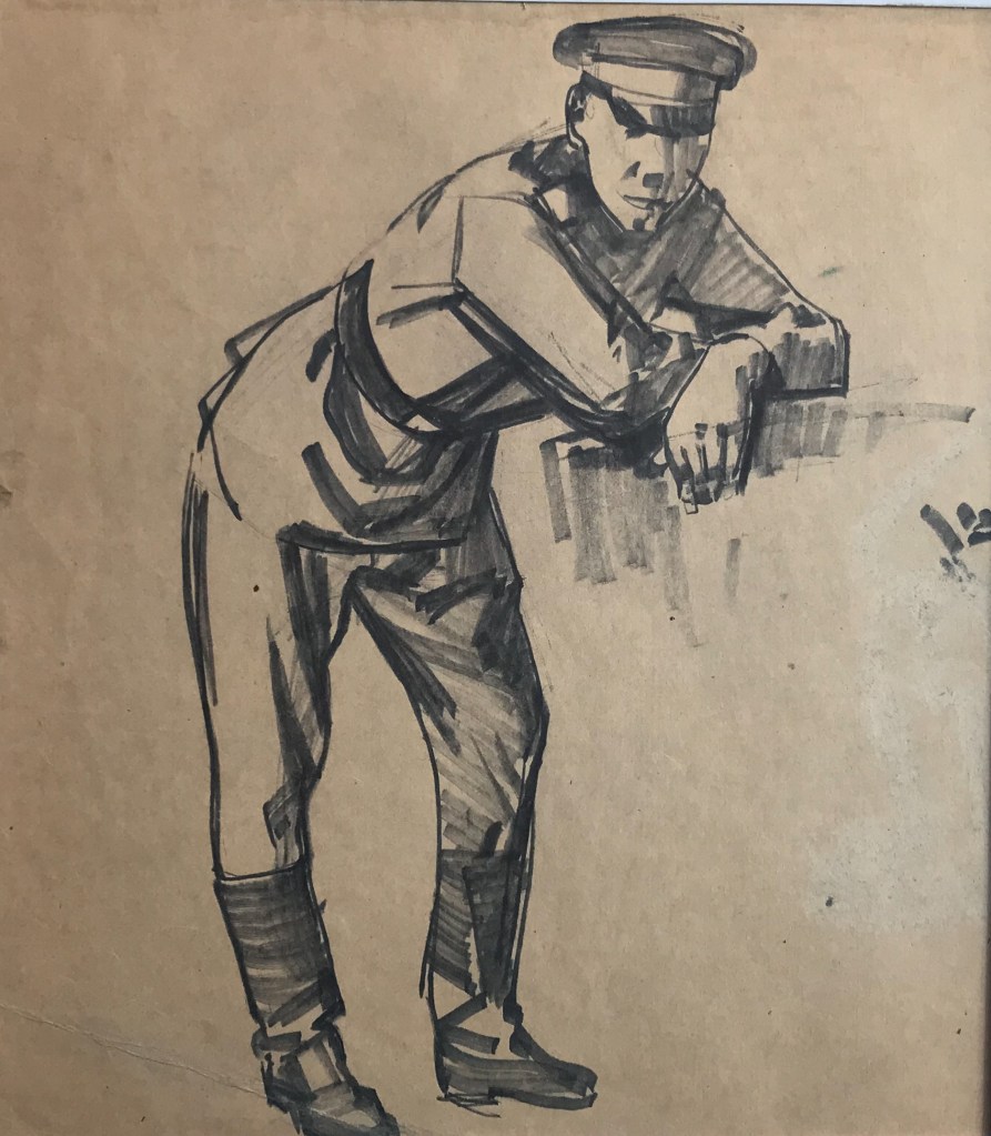 Vintage genre painting by Soviet Ukrainian artist A.Kostenko. Pursuit of a criminal, soldiers with a dog